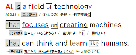 (人工知能とは、人間のように考えたり学習したりできる機械を作ることに焦点を当てた技術分野です)