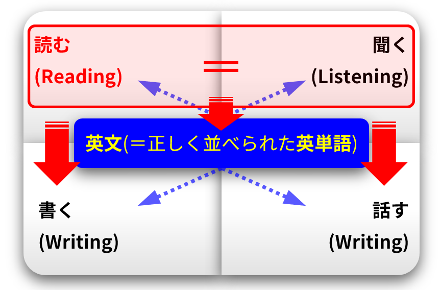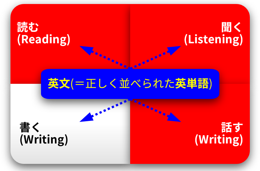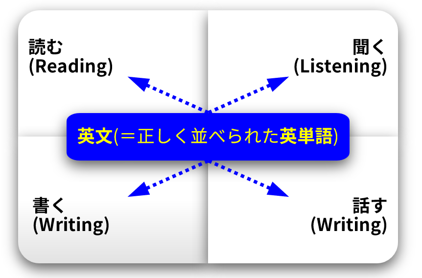 上の図のように、英語力の正体とは、正しく並べられた英単語を、目で「読んで」理解できれば Reading、耳で「聴いて」理解できれば Listening、手で「書いて」表現できれば Writing、口で「話して」表現できれば Speaking という“1つのスキル(技能)”です。ちなみに、英単語の正しい並べ方のルールを「英文法」と呼びます。