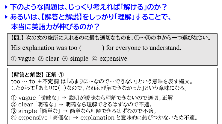 授業を受けて理解したら、問題集や過去問を大量に解く ―誰もが疑うことなく、あらゆる教科で行っている勉強法です。ところが、数学や国語と異なり、英語は「問題を解くこと」自体が実力に直結するわけではありません。