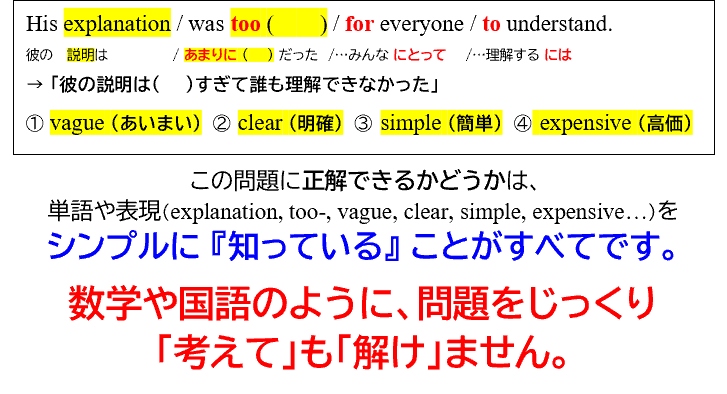 以上のような学習で、あらゆる試験のどのような出題形式にも対応できる英語力を養成します。このようなトレーニングが、最も効果的な試験対策になる仕組みについては、以下のリンクで詳しく解説しています。