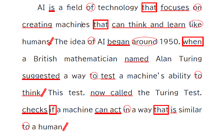 そこで、まず「手(ペン)」を使って構文・単語を把握しながら、英語の語順のまま「正確に」読むトレーニングを行います。構文把握のトレーニングには様々な手法がありますが、GCAでは文法的な厳密さと実践的な読解スピードのバランスを極限まで追求した『6つの記号』による構文マーキングを使います。