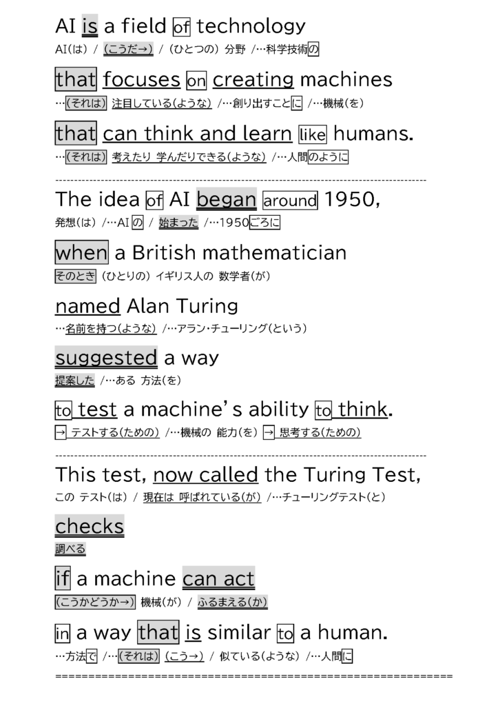 そこで、英語の語順で意味を理解し、英語⇔日本語をできるだけすばやく(最終的には無意識に)往復できるようになるための、3ステップの「読む」トレーニングを行います。