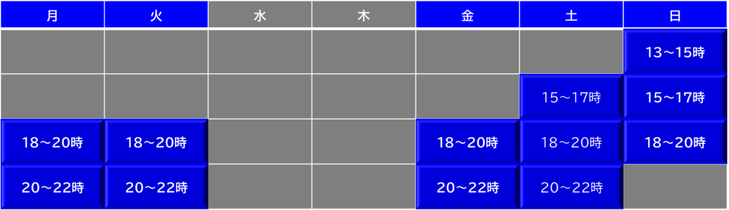 - 1か月あたり4回受講できます(下記参照)。受講日時は自由に選択できますが、できるだけ週1回の受講ペースを守ってください。